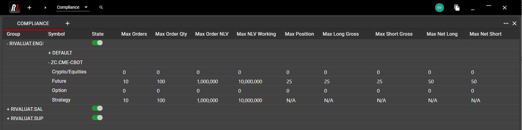 Compliance limits are set at the Group level and apply to all Users within that Group. Limits may be set per Symbol for a Group, using exchange symbology. If limits are not specified for an individual Symbol, the Default limit settings are used.