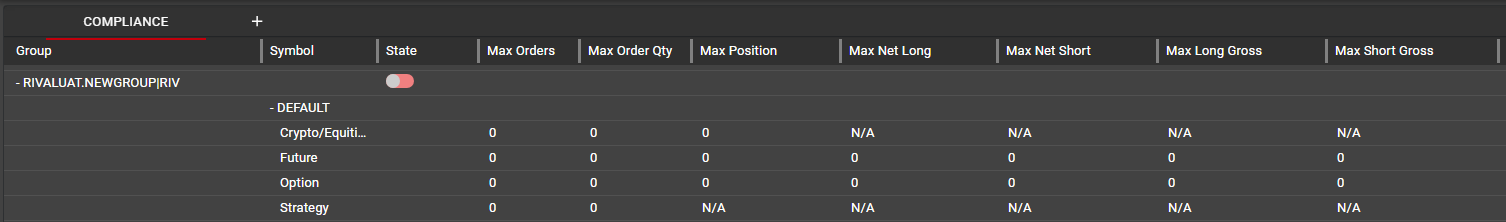 The new Group will now display as Firm.Groupname|Clearingfirm, as shown below. For newly added Groups, the Compliance State will default to Disabled, indicated by the red color on in the State toggle below. Limits may be enabled or disabled only at the Group level. In order to provide as much security as possible when setting up limits, all limits will default to zero, both in the Default category and for any new Symbol that is added to Compliance.