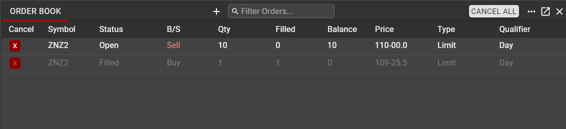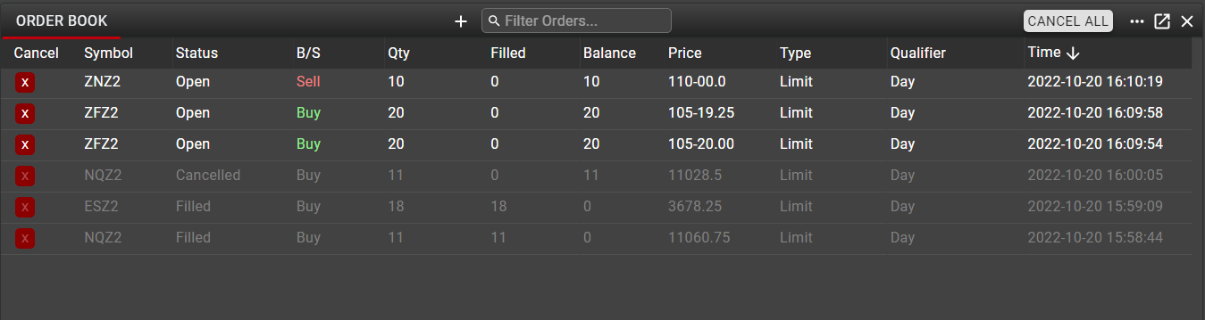 The Order Book is the central location for managing open orders across all instruments. The Order Book will display the status of all orders and allow the user to cancel their working orders individually or globally. Users may also amend price and quantity on working orders directly from the Order Book.