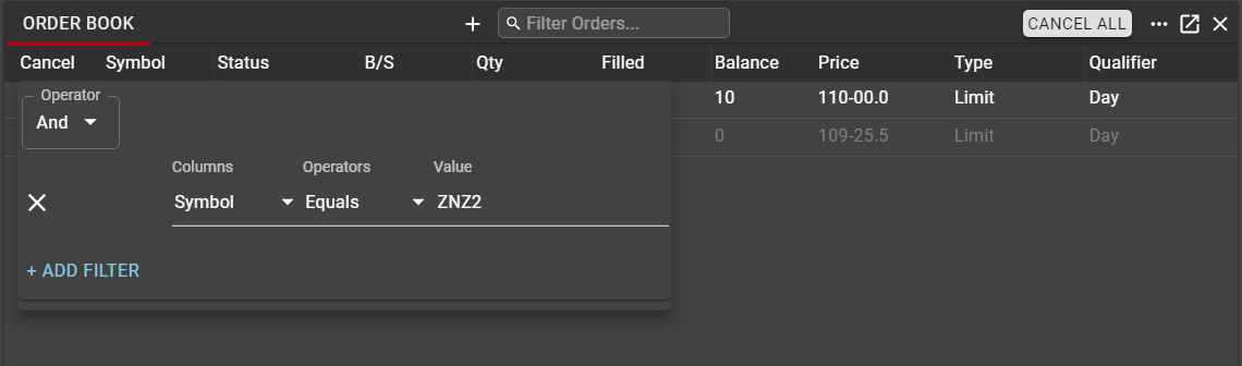 As with other components in Rival One, filters may be applied to data in the Order Book in an and/or configuration, based on criteria for one or more columns. This is most often used to filter orders for a particular Product or group of Products.
