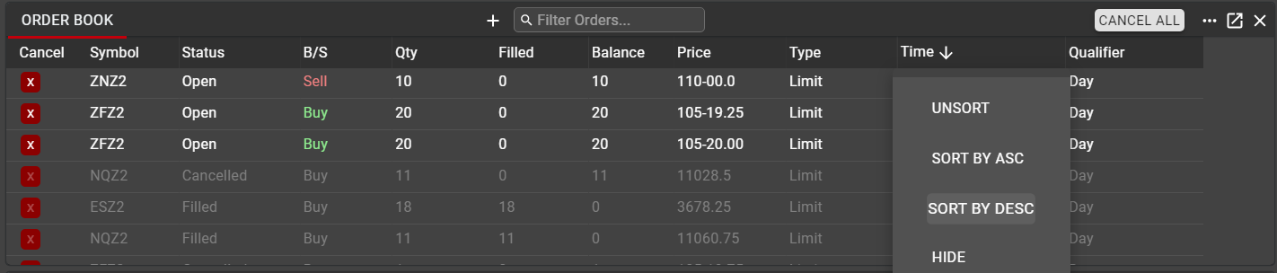 In addition to filtering, any column in Order Book may be sorted. Right-click in the column header to expose the context menu. From this menu, users can apply or remove a sort or may hide the column altogether. As with filtering, sorting should be applied with caution. Orders that have been sorted, and which may not be visible in the current view, retain their status and may still be filled at the exchange, whether or not the user has them visible in their workspace.