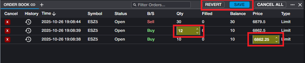 Once SAVE is clicked, all changes are executed. The REVERT button will undo all staged changes and revert all orders to their previous state.