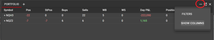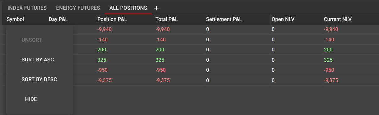 The following columns are available for all positions. Any of these columns can be shown or hidden using the ellipsis menu, and may be rearranged by dragging, dropping or re-sizing individual columns according to the user’s preference.