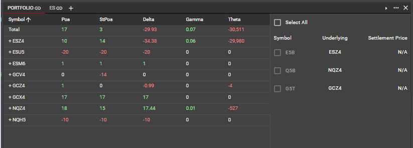 The Portfolio component contains information on all positions—both Start-of-Day and session activity—as well as P&L for all instruments traded by the user.