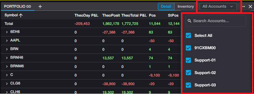 Note that the Account selection is unique to each tab in the Portfolio, allowing users to view positions for each Account in separate tabs if desired.