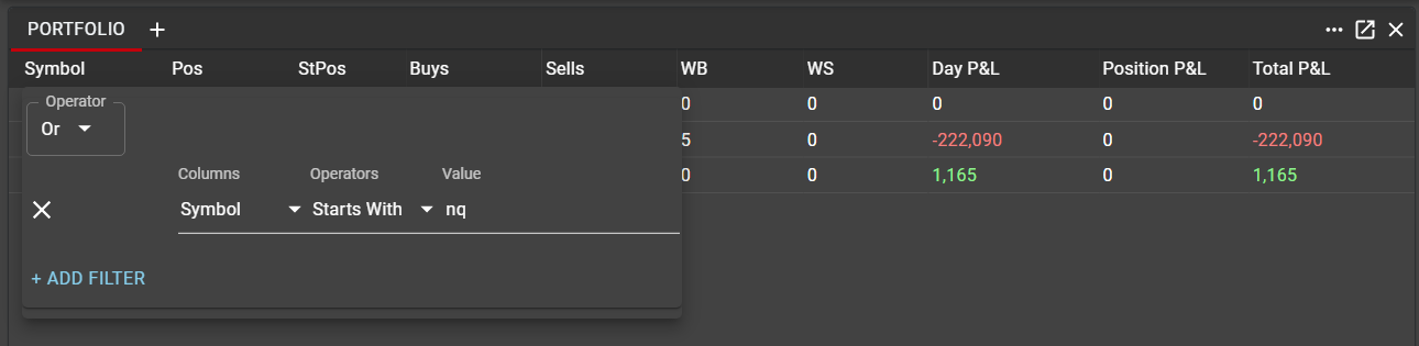 As with other components in Rival One, filters may be applied to data in the Portfolio in an and/or configuration, based on criteria for one or more columns. This is most often used to filter orders for a particular Symbol or group of Symbols.