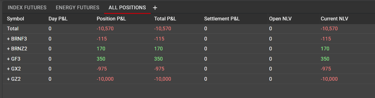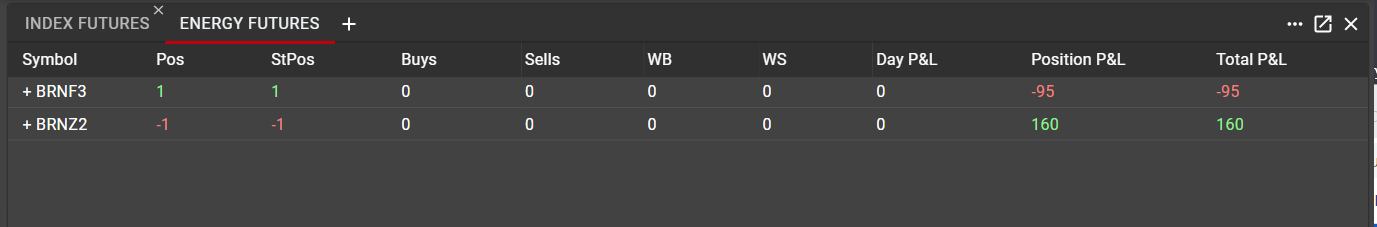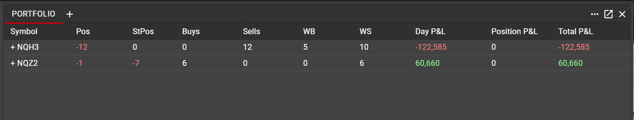 Multi-leg exchange-listed spreads are treated differently in Portfolio component than outright instruments. A spread will only appear in Portfolio when there is a working order in the spread, in which case the only columns populated for that order will be WB/WS (Working Buys/Working Sells).