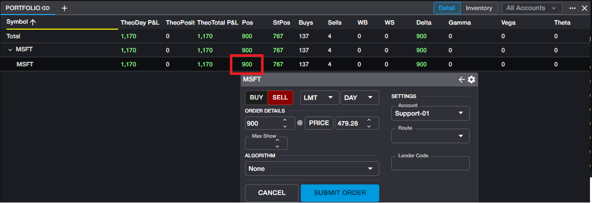 For example, in the below screenshot, the user is long 900 shares of MSFT. Clicking on that position will open an Order Ticket to sell 900 shares at the current price of 479.28.