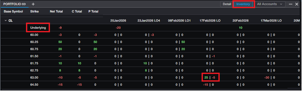 By default, the Portfolio opens in Detail view, where users can customize the columns listed above. Portfolio also offers an Inventory View, to allow users to view their inventory across all terms within a selected complex. This view is specifically designed to help manage Option positions, but all positions are included in the Inventory View.