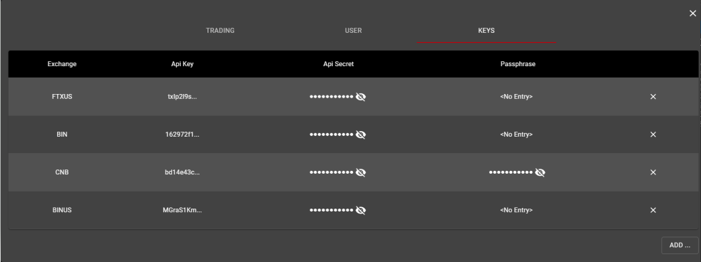 Each Crypto exchange uses an API Key, analogous to a Username; and an API Secret, analogous to a password. The Coinbase exchange employs an additional level of security by requiring a Passphrase. For exchanges that do not require a Passphrase, this field may be left blank.