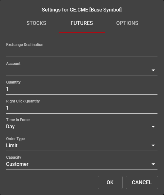 Right Click Quantity: Used as a second default quantity when placing orders in the Ladder only, often for larger order quantities.