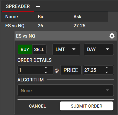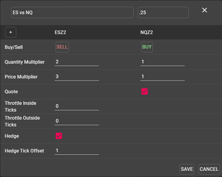 Quantity Multiplier: Determines the ratio in which the spread will trade. In the above example, this spread will work to execute 2 ES contracts for every 1 NQ contract.