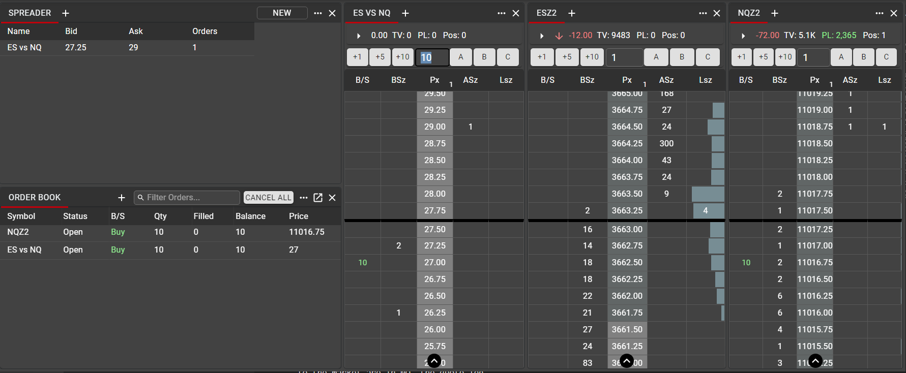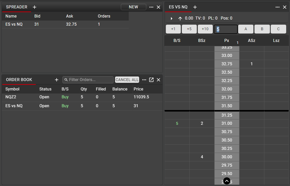 In this example, using the same ES vs NQ spread shown above, a Ladder is displayed for the generated synthetic spread market, and Ladders for each leg are displayed alongside.