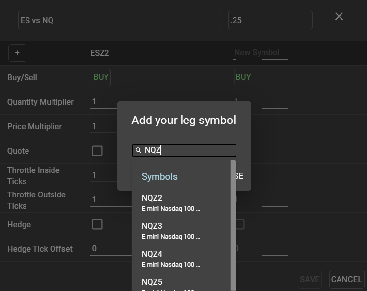 Because the ES contract is more liquid than the NQ contract, ES is used as the hedge leg, or driver leg. This means that the NQ contract is the quote leg. When orders are entered in the synthetic spread, the orders sent to the market are in NQ, the quote leg.