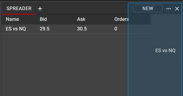 Most users will want to see their synthetic spreads displayed in a Ladder. This can be accomplished by dragging and dropping the spread name from the Spreader window. Dragging into a space on the canvas will generate a new Ladder for the synthetic instrument, or the spread may be added to an existing Ladder component as a new tab.