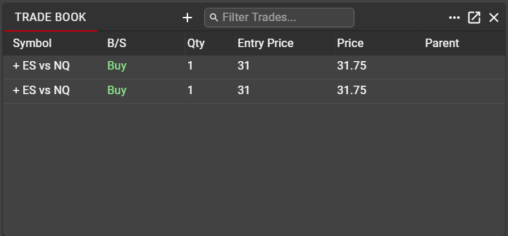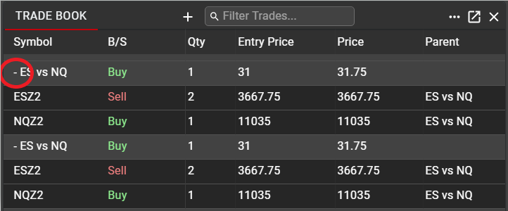 By default, only the Parent synthetic spread order will be displayed as an entry in Trade Book. The Parent spread will show the Entry Price, at which the spread order was submitted, as well as the average executed Price, based on all legs for the order.