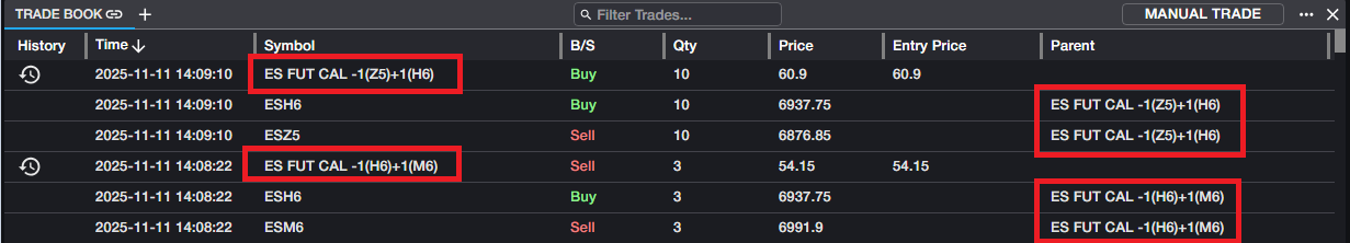 When receiving a fill on a Spreader order, Trade Book will display the Parent fill as well as each individual leg fill. Click on the ‘+’ next to the Spreader fill to display all leg fills associated with that trade.