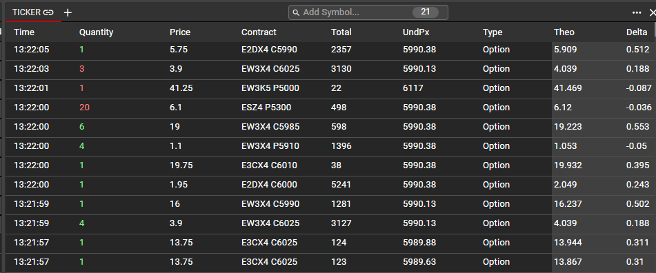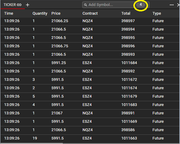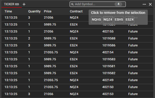 Once a Symbol has been added, users may use the Search tool again to add another Symbol. Users may add as many symbols as desired into one Ticker window, and all trade activity will be displayed strictly chronologically for all Symbols selected.