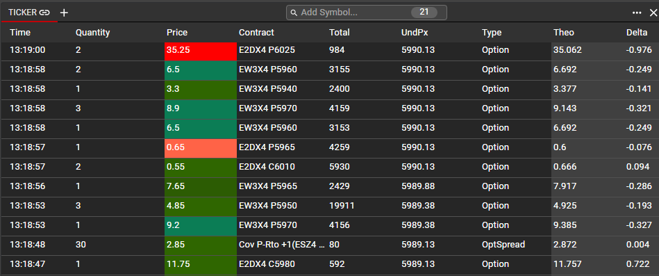 Users have the ability to apply heat mapping to Ticker for options and option spreads. Heat mapping will show how far the instrument's traded price is above (red highlight) or below (green highlight) the theoretical value. As in Option Chain, the red and green highlights will darken the further the value is from theo. This setting can be enabled or disabled from the Ticker menu.