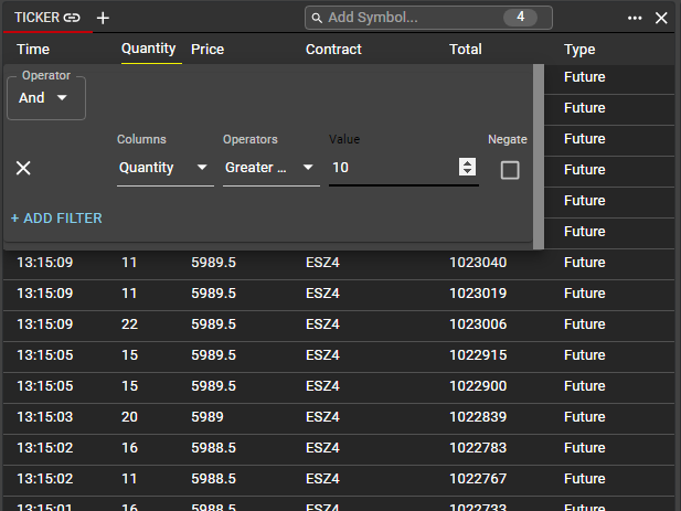 When adding a Symbol to Ticker, any and all trade activity for that Symbol will be displayed. For a more refined display, users may apply filters in order to display only the trades meeting the user’s specified criteria. Most commonly, filters may be used to restrict displayed trades by trade quantity.