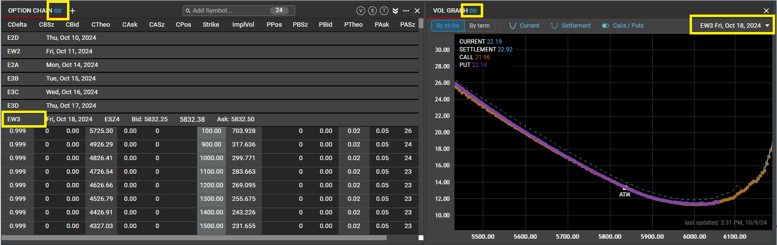 Option Chain can be linked to to Vol Graph. Once both components are assigned a linked group, clicking on a term header in the Option Chain will display the Vol Curve for the selected Term. See the Workspace Overview article for more details on component linking.