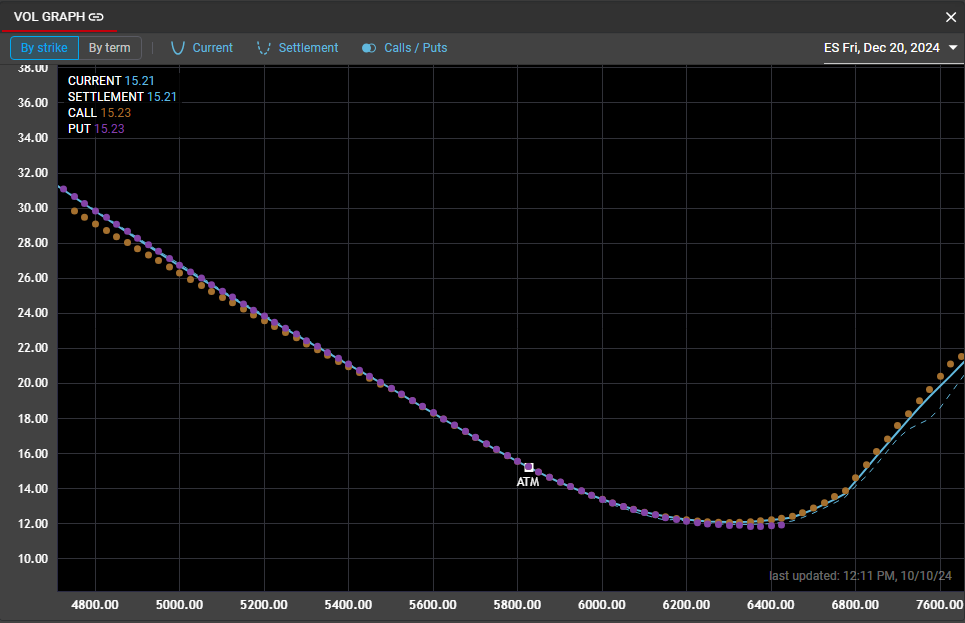Current curve displays the last calculated implied volatility at each strike. Rival's autofit curve updates on a regular interval but will also re-calculate with a move in the underlying instrument or in global volatility. The lower right corner of the Vol Graph will display the time of the last calculated curve.