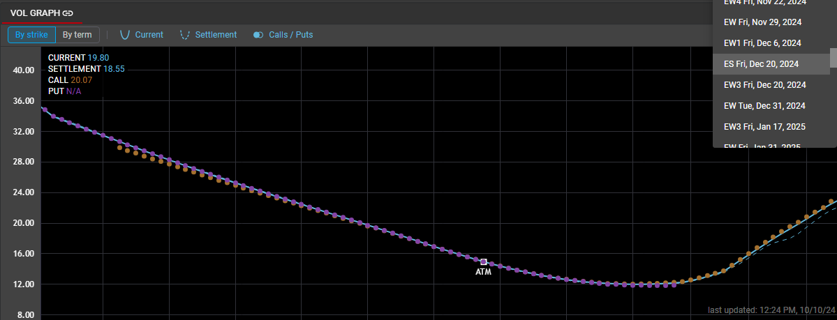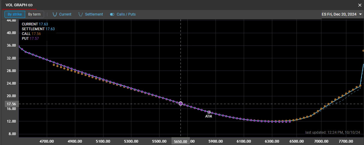 Settlement curve displays Rival's calculated settlement volatility for each strike and is displayed as a dashed line. Note that the calculated settlement volatility is not the volatility that is published by the exchange. Both settlement vol and implied vol are determined based on the autofit curve, to provide a consistent measure of volatility.