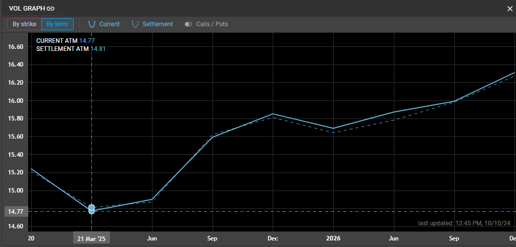 Selecting the 'By Term' mode in Vol Graph will display the at-the-money volatility over all terms for the selected options series. In this mode, the X-axis represents time to expiration, and the Y-axis represents ATM volatility. The same volatility curves (Current, Settlement and Call/Put) are available in the Term Structure.