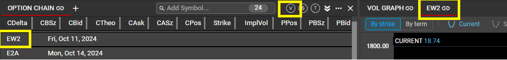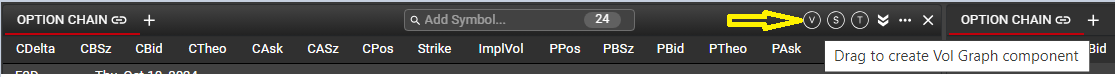 Vol Graph can be opened from any Option Chain, using the 'V' icon from the Option Chain header. Drag the icon to any spot in the workspace to create a new Vol Graph.