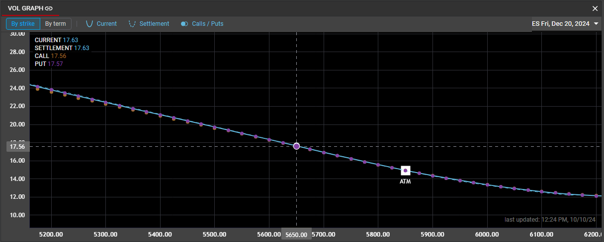 The Vol Graph component displays Rival's calculated volatility surface for any option series. Users can view current curve, settlement curve and volatility at each individual strike. Users may also use Vol Graph to view the term structure for a selected option symbol.