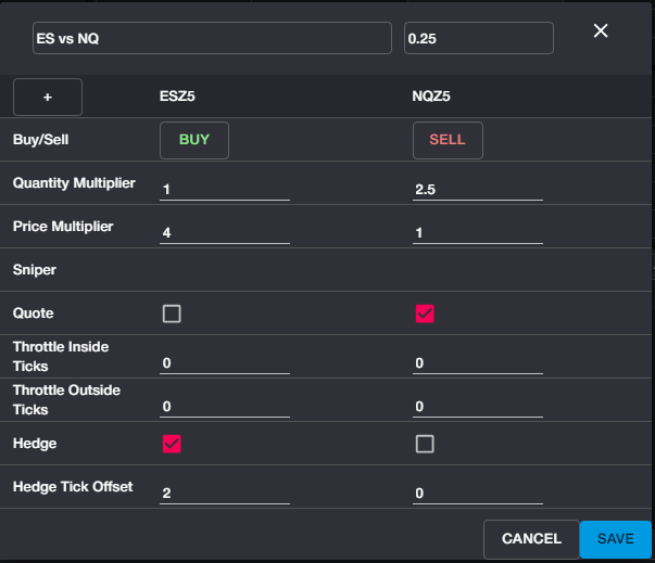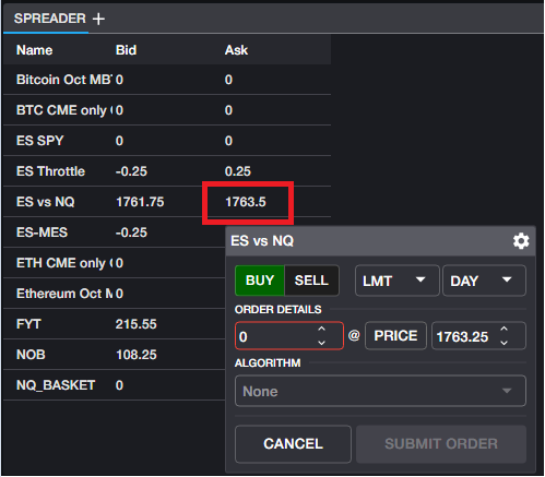 Before entering an order on a Spreader instrument, the instrument must be created and customized by the user. See the Spreader article for full detail on each input field and their usage.