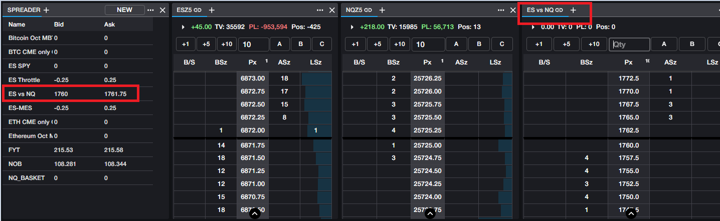 Once a custom spread has been created, you can launch an order directly from the Spreader component by clicking on the Bid or Ask of the custom spread in order to open an Order Ticket, as seen in the first screenshot below. Alternatively, users can launch a Ladder for their custom spread as seen in the bottom screenshot.