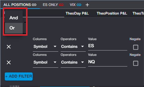 Filters can be applied in an AND/OR manner by making a selection from the dropdown menu.