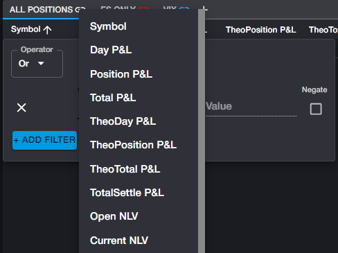 Click ADD FILTER to enter a new condition. Any columns that can be filtered will be listed in the dropdown menu: