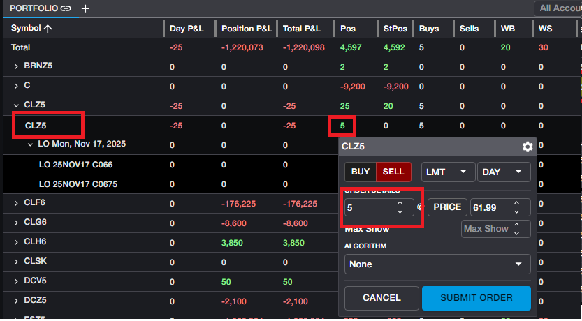 In addition, clicking on the Position value on a specific instrument will open an Order Ticket for that instrument, pre-populated with your current quantity. This can be used to quickly flatten positions, without the need to navigate to each instrument in an order entry component.