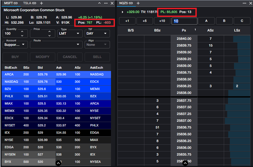 In the Ladder and the Depth Ticket, you can see your current position and P&L for the selected instrument as well.