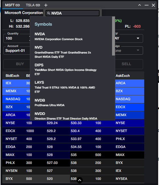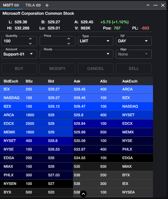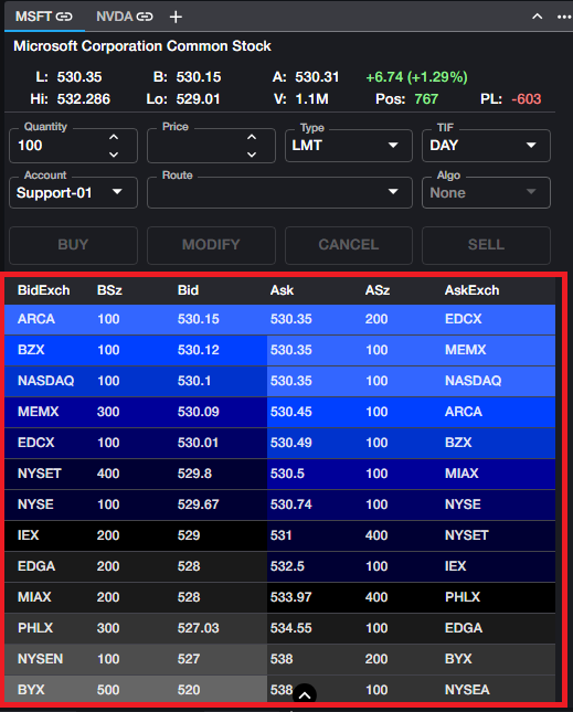 The Depth Ticket is the most commonly used component to view market data for individual equities, as well as to enter and manage orders on equities.