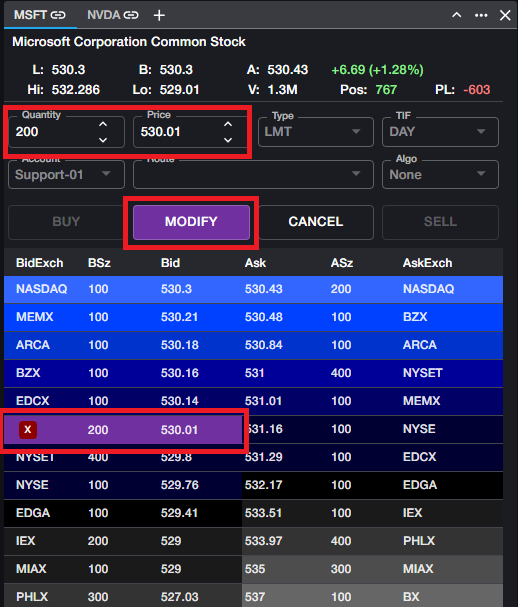 Working orders may also be modified from the Depth Ticket. To modify a working order, click on the desired order. When an order is selected in this manner, all order attributes will be populated in the order entry panel and the MODIFY button is activated.