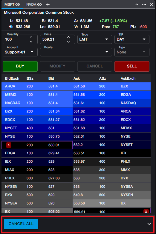 Working orders can be cancelled directly from the Depth Ticket by clicking the red [X] icon located next to each order. In addition, users can expose the bottom panel of the Depth Ticket using the arrow at the bottom of the market data grid. The bottom panel contains a CANCEL ALL button, which will cancel all working orders in the selected instrument, regardless of where those orders reside.