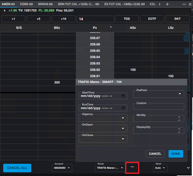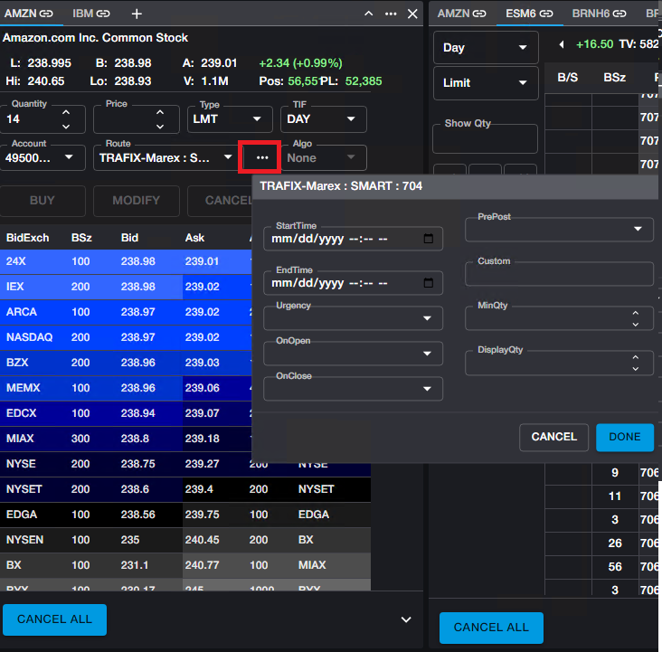 Execution for Equities and their Options, as well as Index Options, is supported through an executing Broker. Orders may be sent from the Order Ticket, the Ladder or the Depth Ticket.